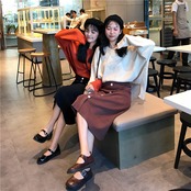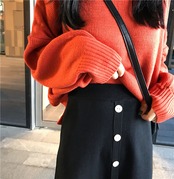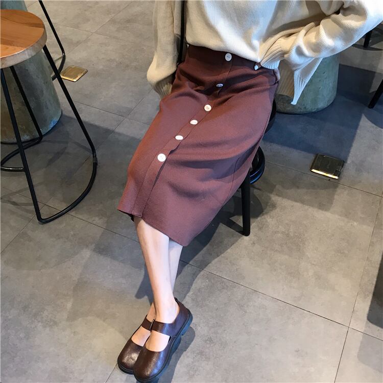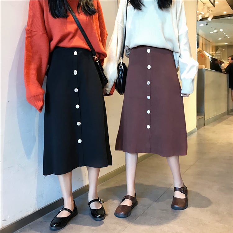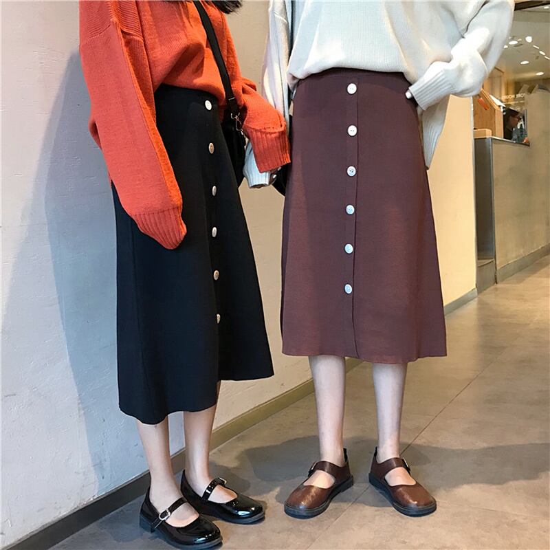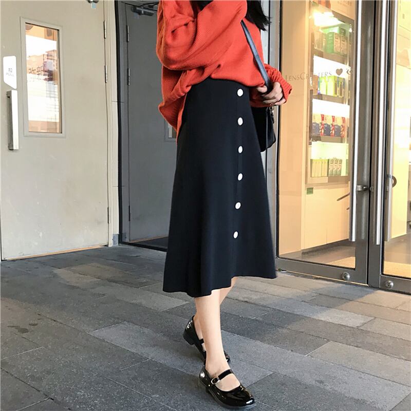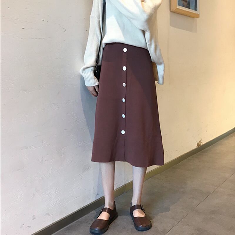 レディース 秋冬新作 オルチャン 韓国 フロントボタン ニット ロング ミモレ丈 ボトムス スカート フレア 【N115】
