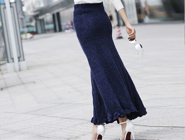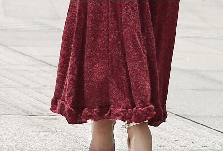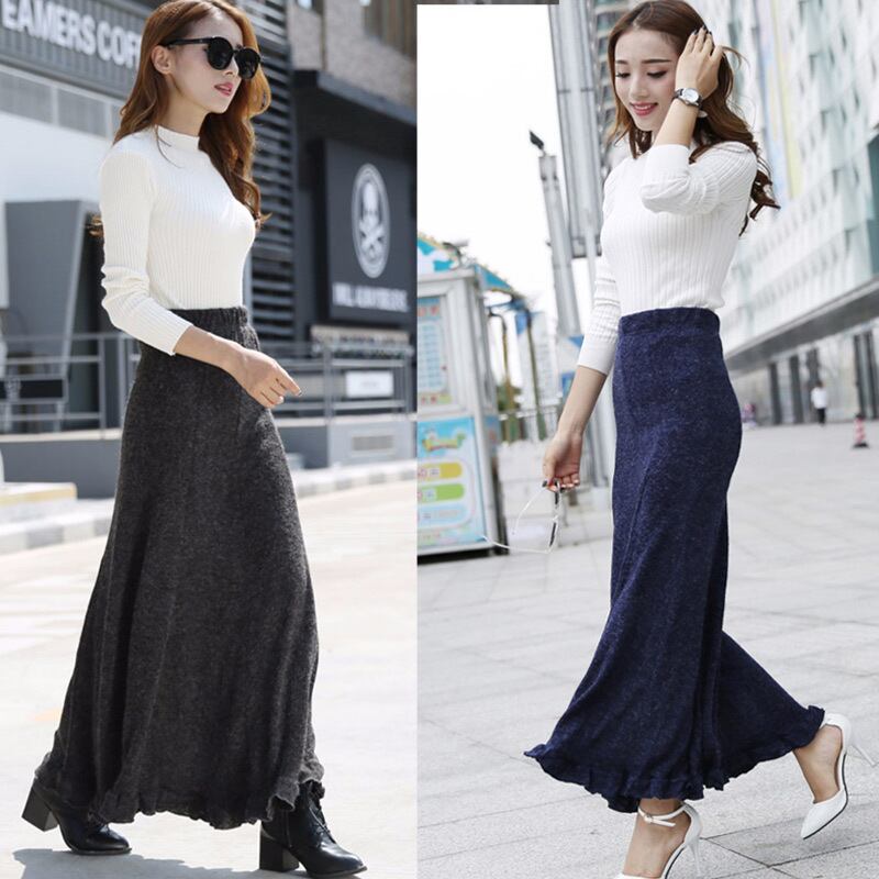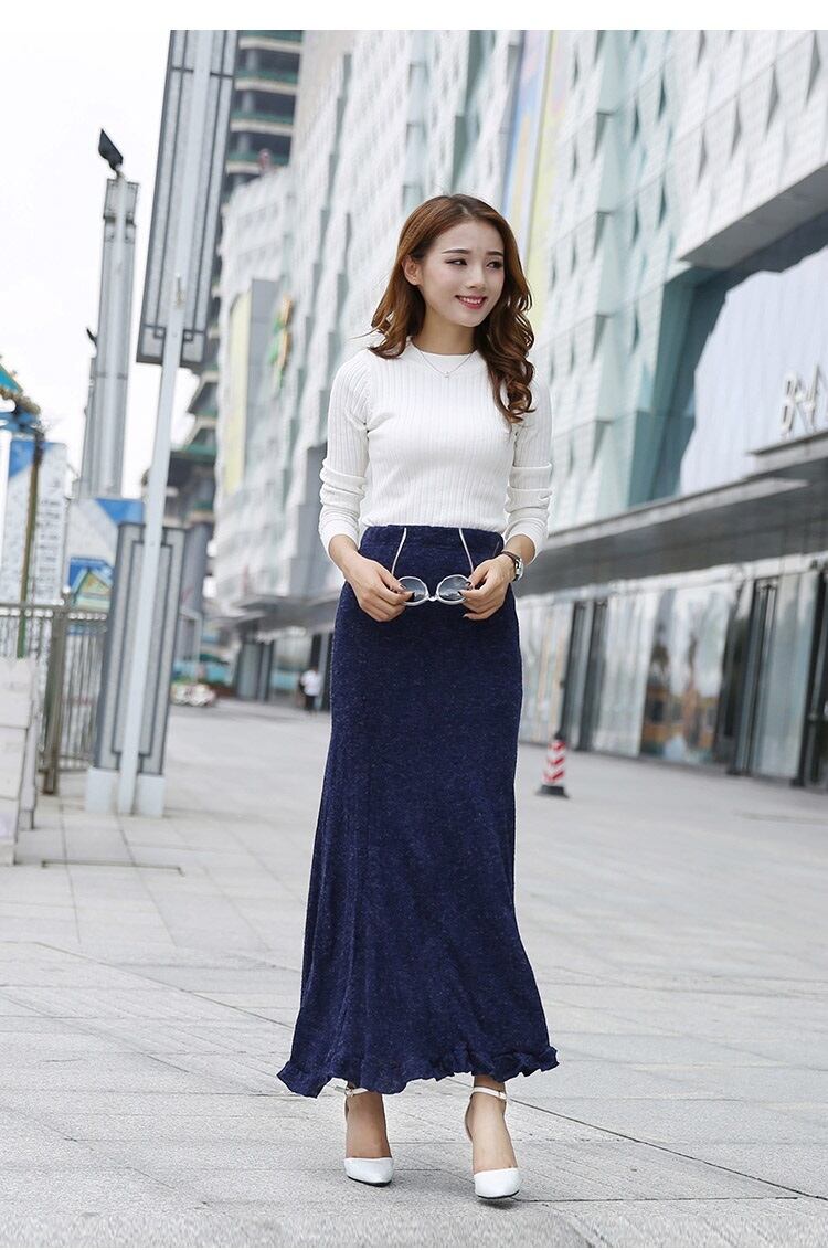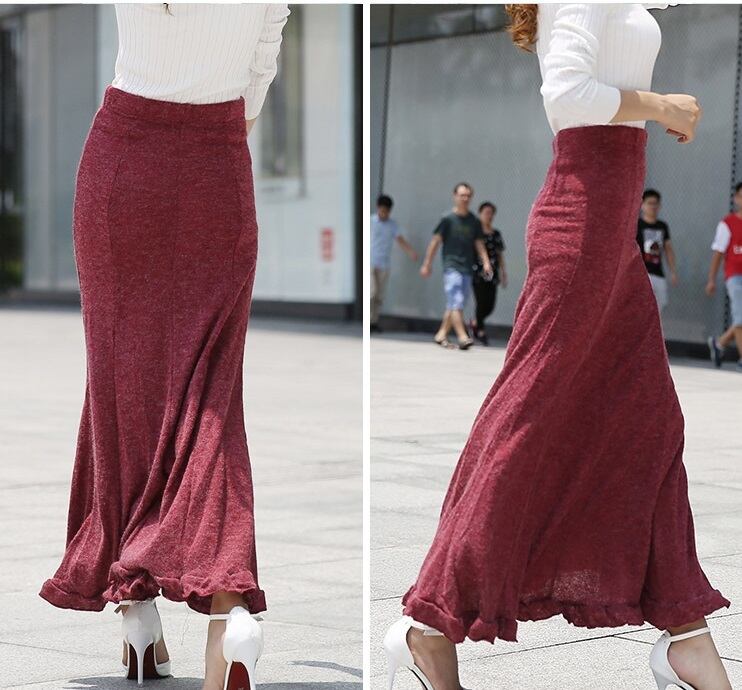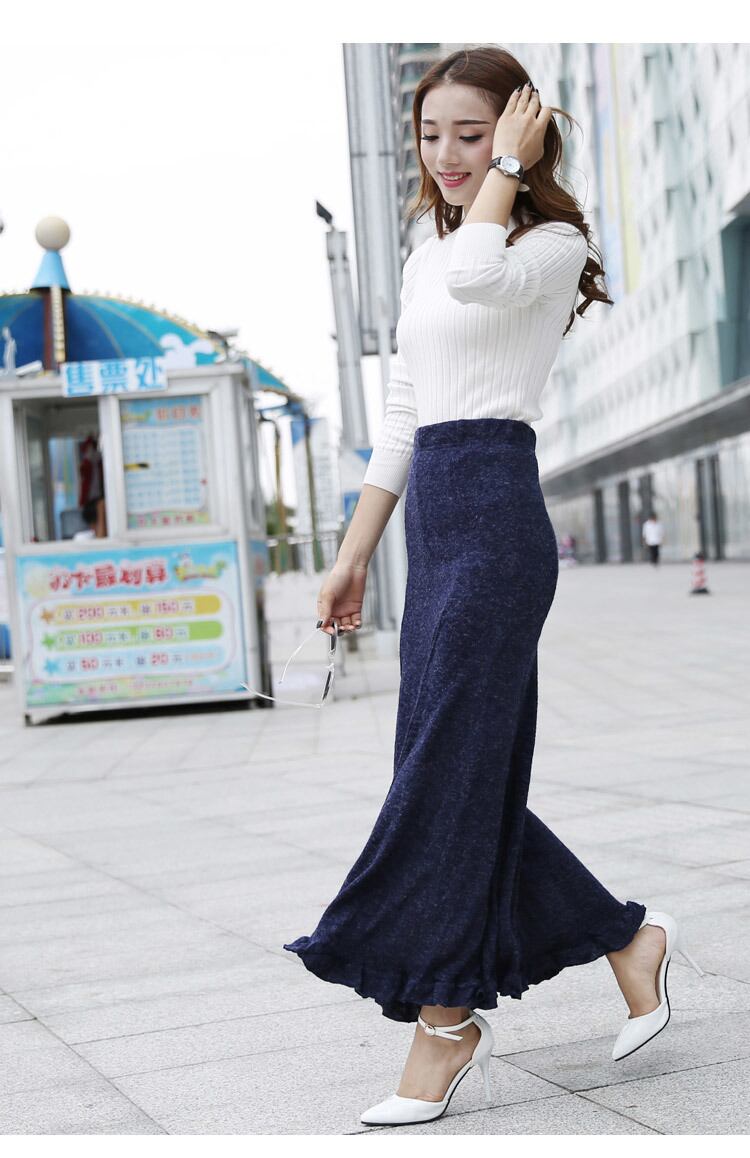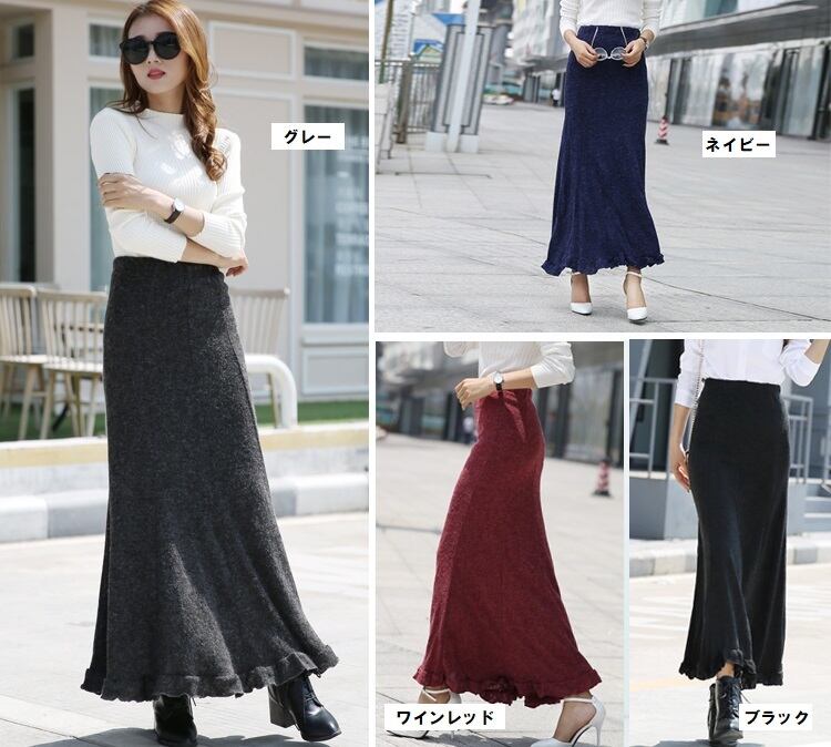 レディース 秋冬新作 オルチャン 韓国 ボトムス スカート ニット ロング丈 ウエストゴム フリル 無地 カジュアル 【N125】