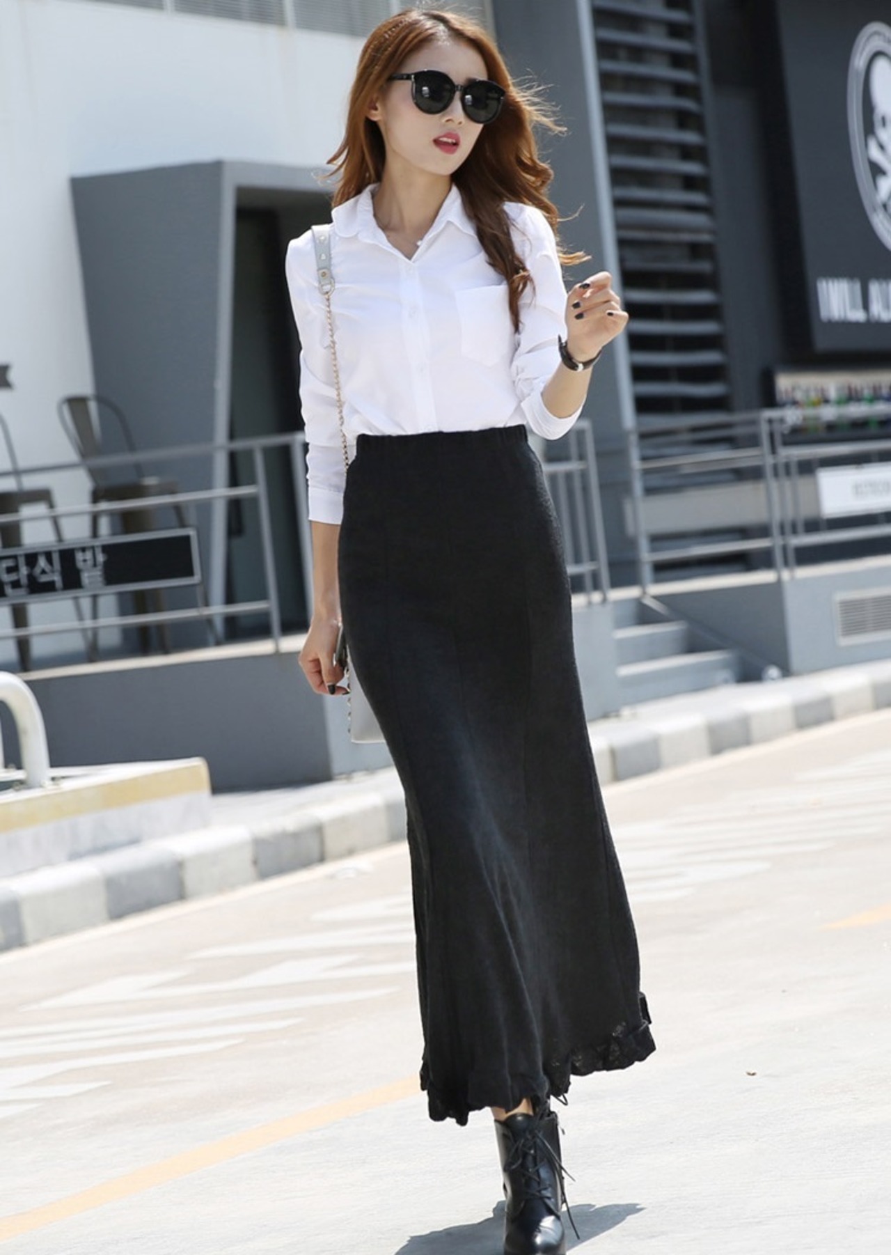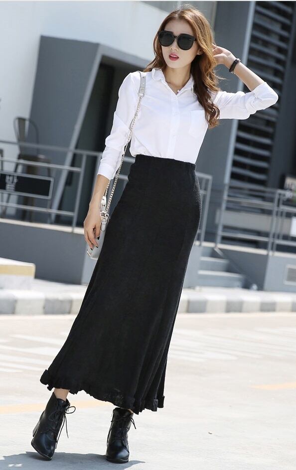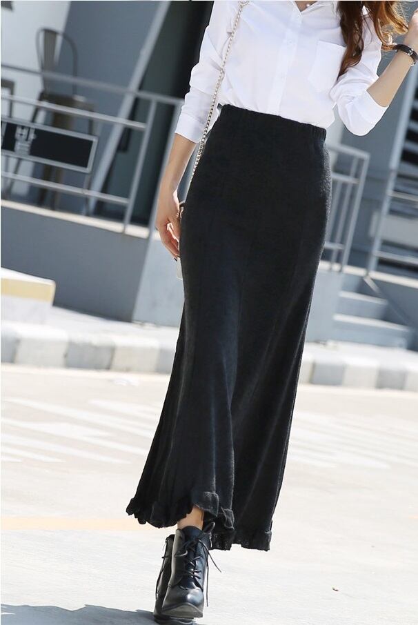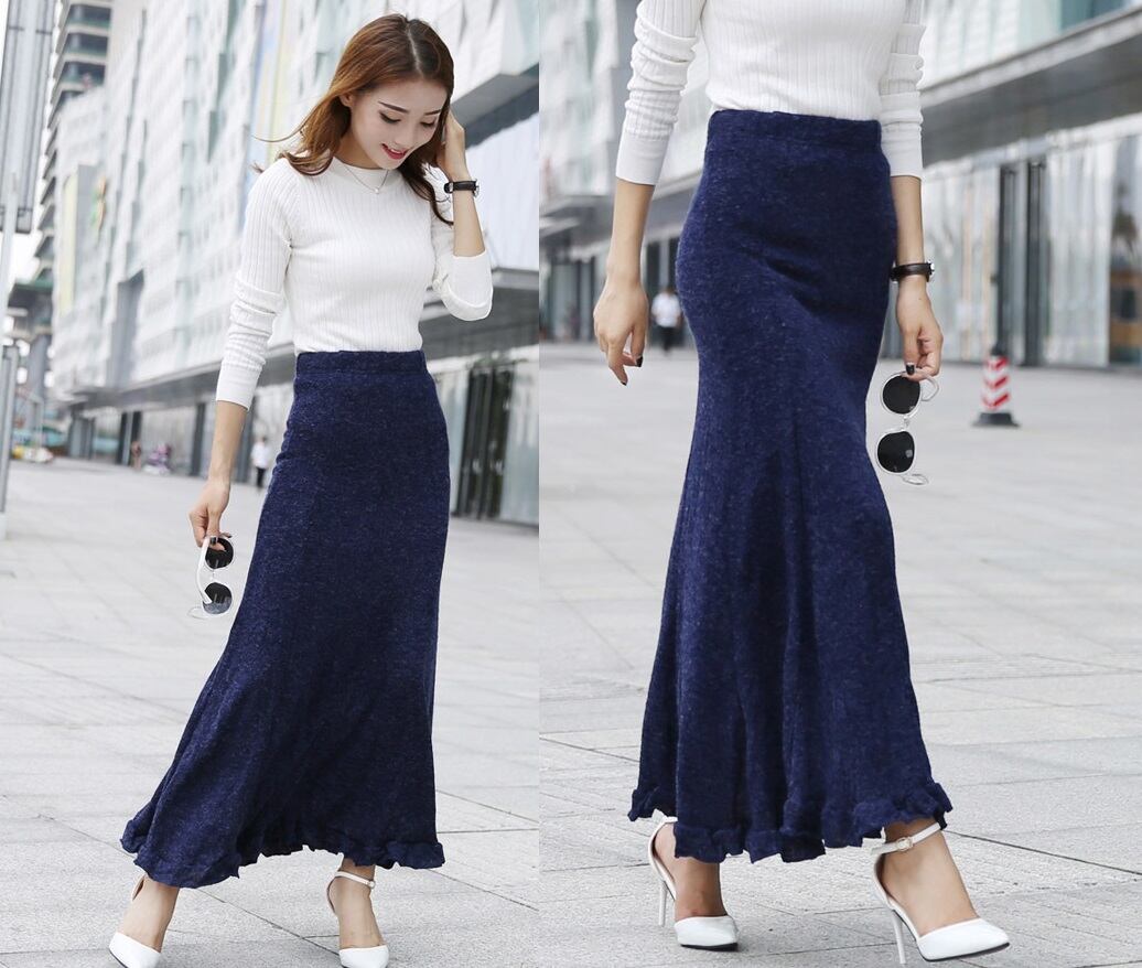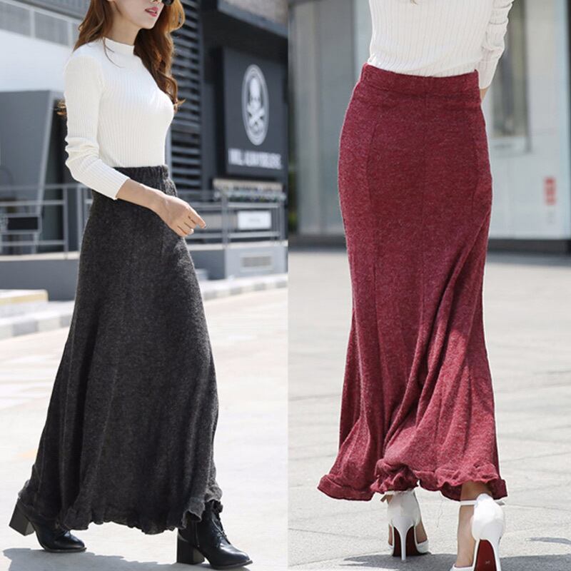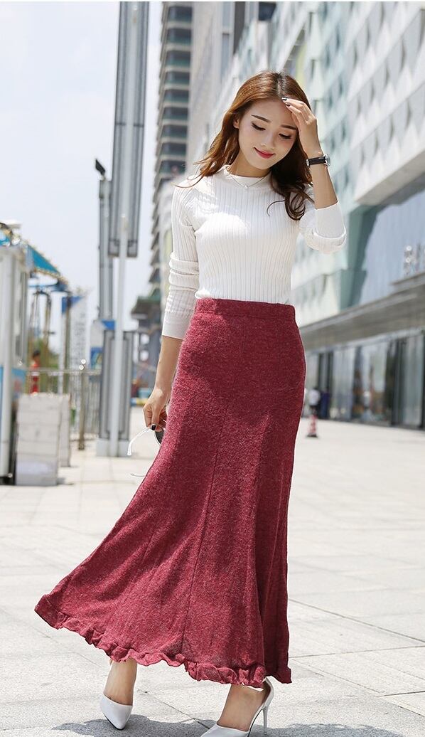 レディース 秋冬新作 オルチャン 韓国 ボトムス スカート ニット ロング丈 ウエストゴム フリル 無地 カジュアル 【N125】
