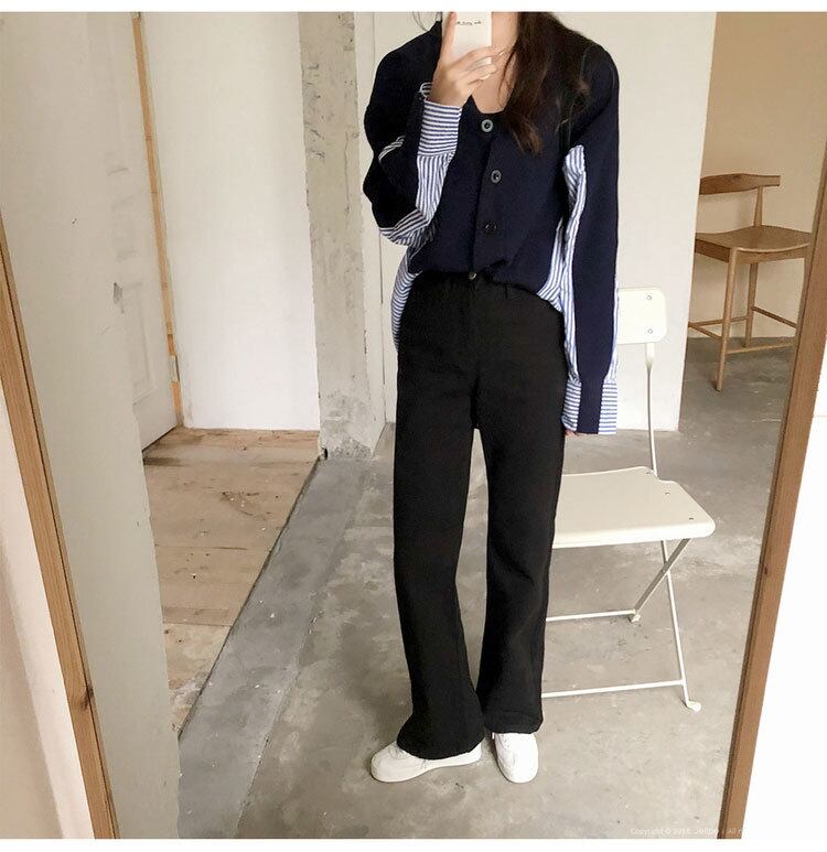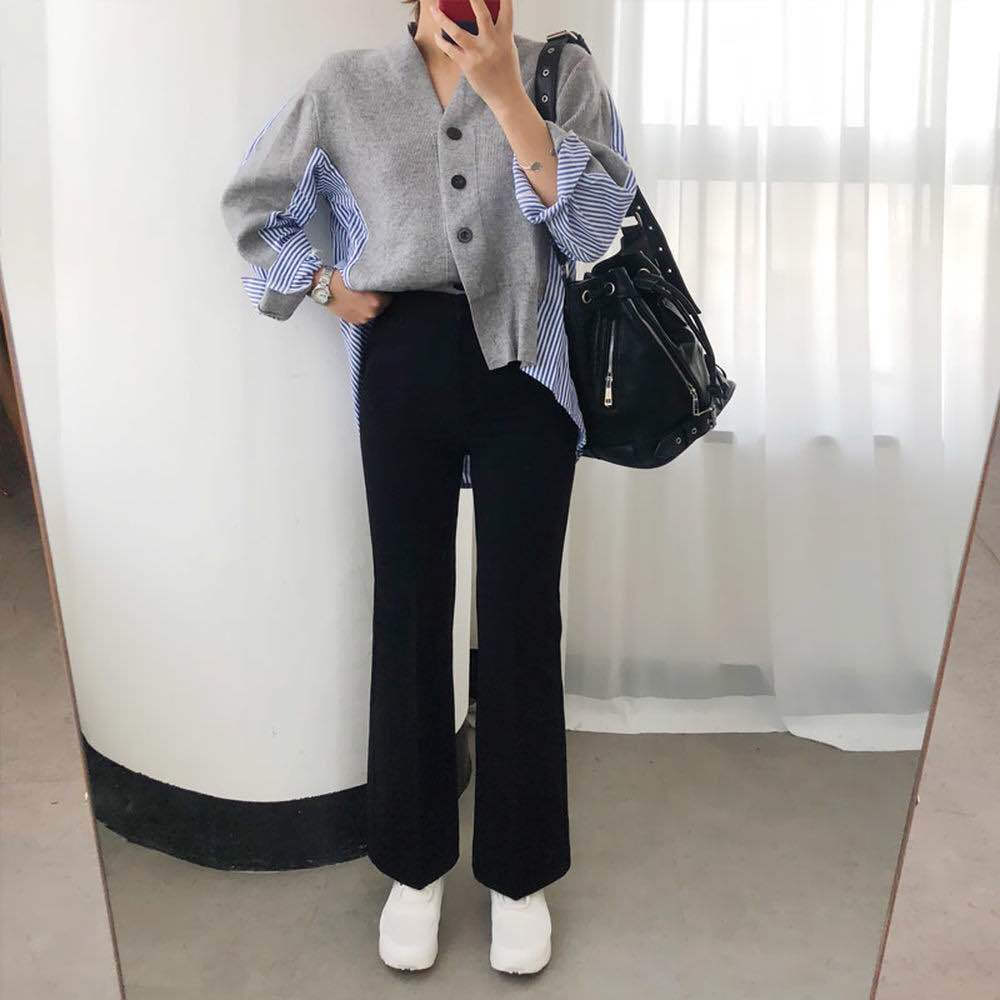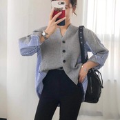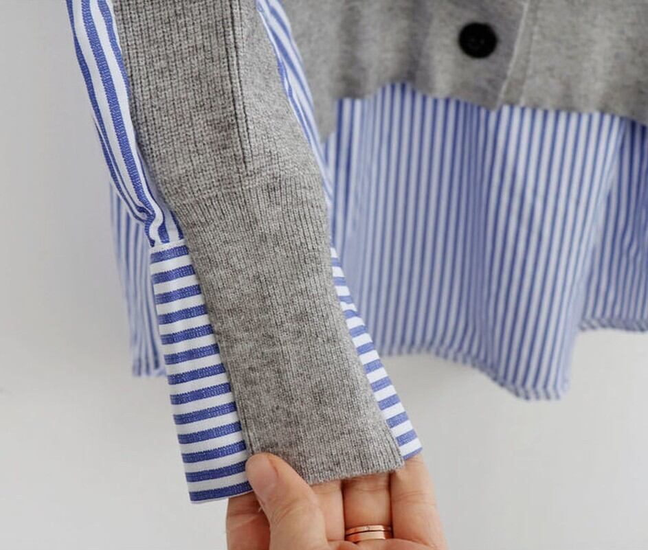 前はニットカーディガン、後ろはストライプシャツでユニークな組み合わせ☆