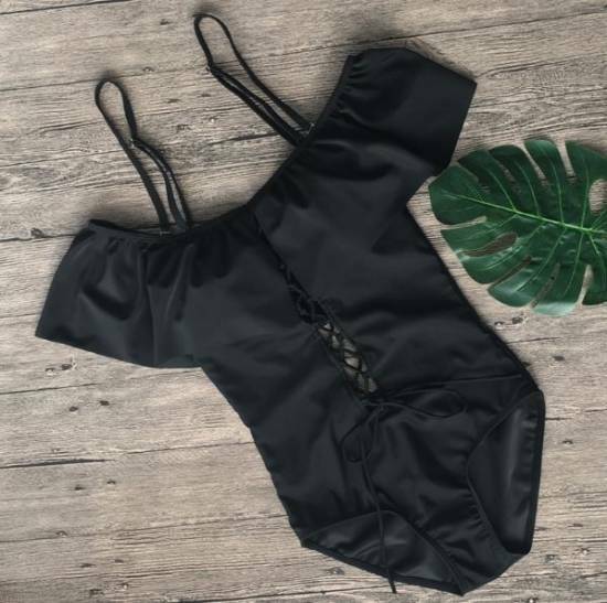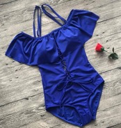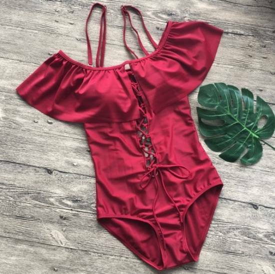 肩周りのラッフル、フロントのレースアップ、オフショルダーデザインのモノキニ。