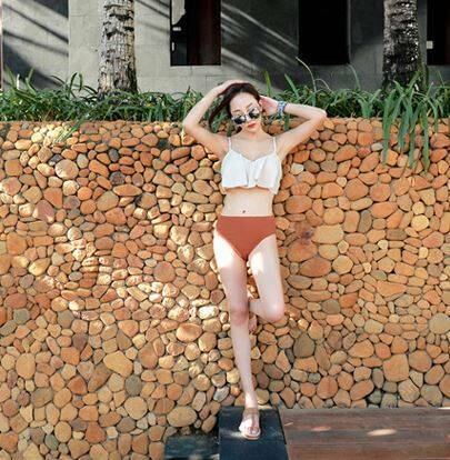 たっぷりフリルのトップが可愛いタンキニタイプのビキニ。
