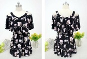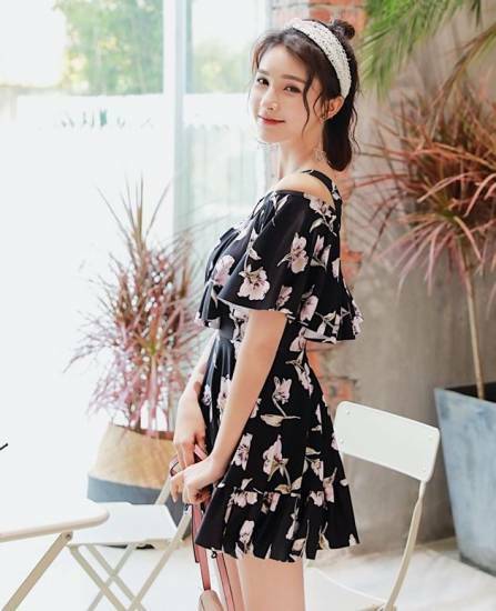 ショルダーのカットアウトがお洒落なスカートタイプのワンピース。