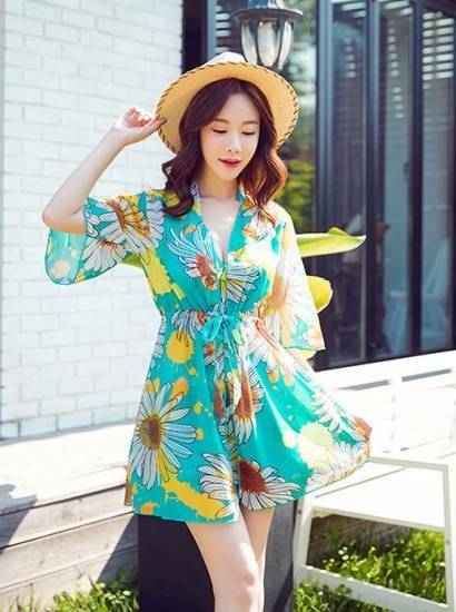 大柄なフラワープリントがリゾートを感じさせてくれるセット水着です。