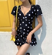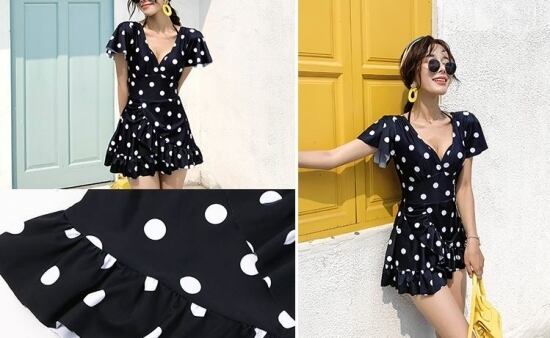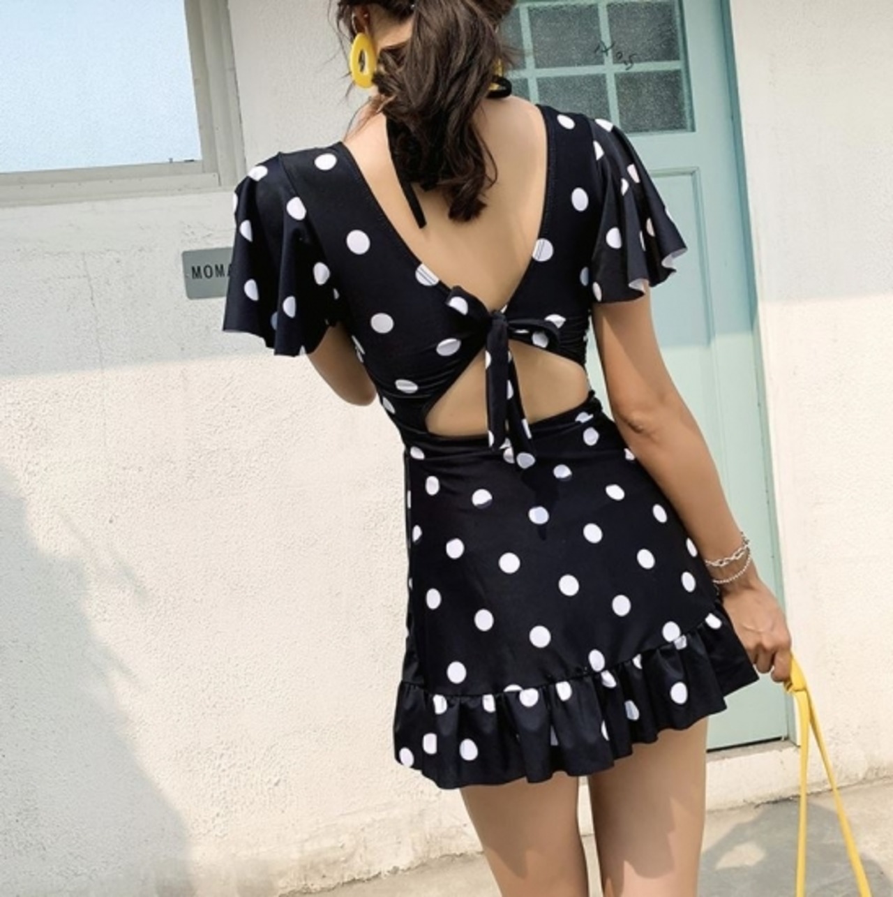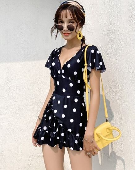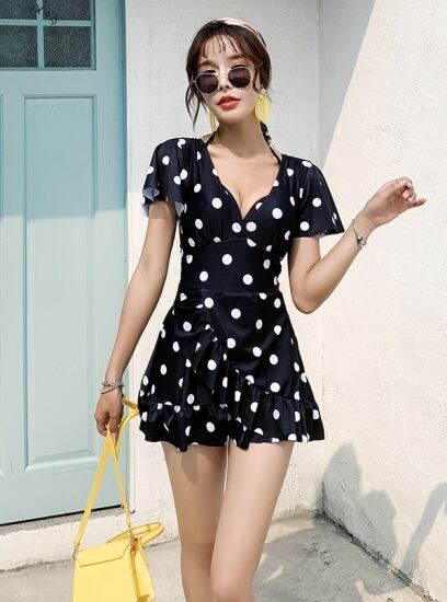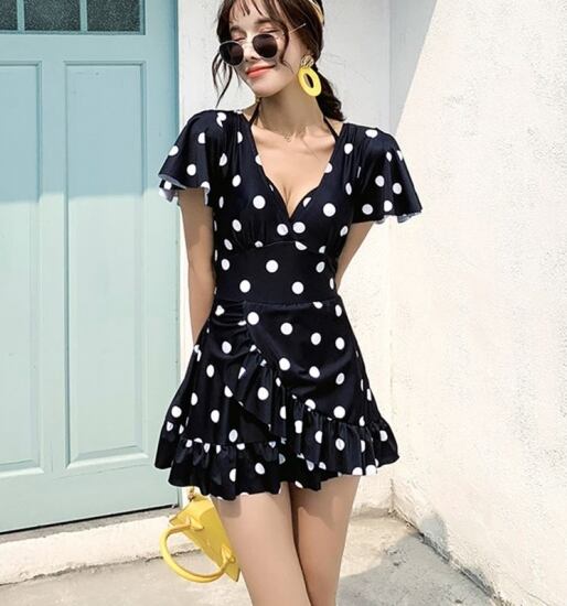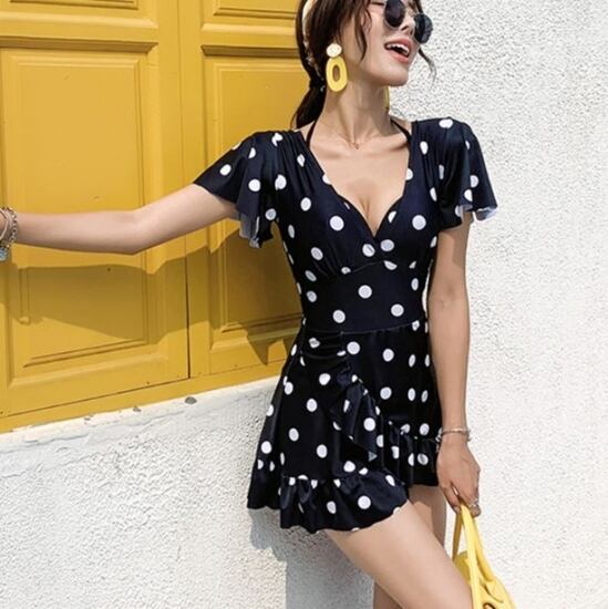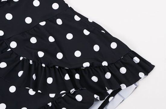 大きめのドット柄が大人可愛いスカートタイプのワンピース水着。