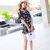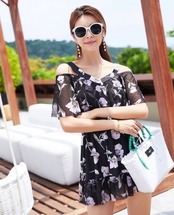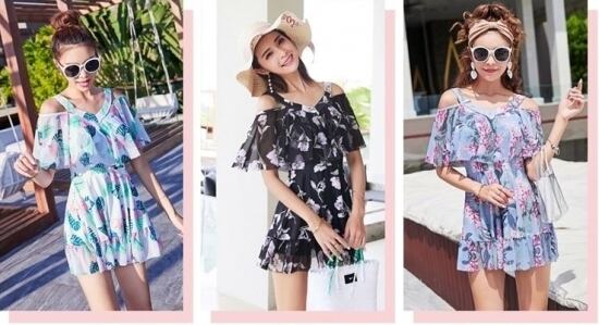 ショルダーのカットアウトがお洒落なスカートタイプのワンピース水着。