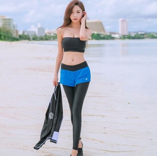 鮮やかなブルーのパンツがひときわ映えるラッシュガード&パンツセット。