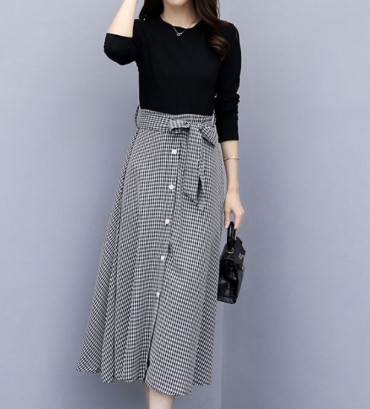ロングワンピース ロングワンピ レディース 大きいサイズ ラウンドネック 長袖 セットアップ風 無地 ギンガムチェック柄 ワンピ 秋冬新作 秋 秋色 秋服 秋sale ロングワンピース ロングワンピ
