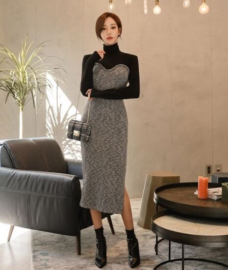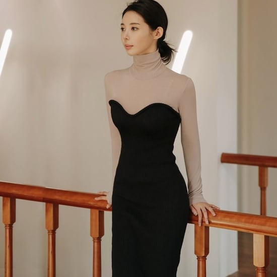 胸元で切り替えたバイカラーニットがお洒落なハイネック長袖のロング丈ワンピース。