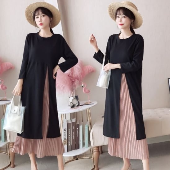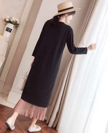 重ね着風レイヤーデザインが印象的なラウンドネック長袖のロング丈ワンピース。