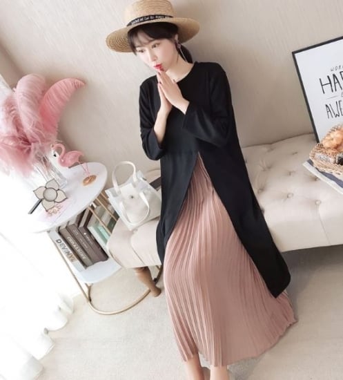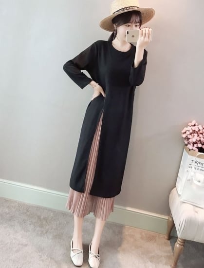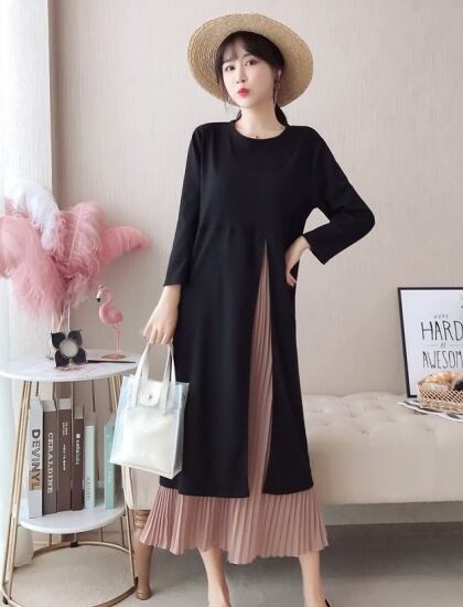 ロングワンピース ロングワンピ レディース 大きいサイズ ラウンドネック 長袖 レイヤー プリーツ ワンピース ワンピ 秋冬新作 秋 秋色 秋服 秋sale ゆったり ロングワンピース ロングワンピ