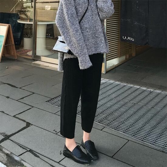 リブ編みのニットがお洒落なテーパードパンツ。