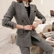 スマートなシルエットが好印象なパンツスーツ。