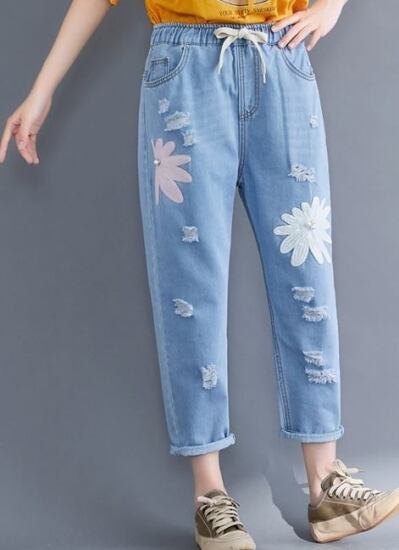 パンツ デニムパンツ レディース ボトムス 花 フラワーパッチ ワッペン ダメージ デニム クロップド パンツ ドローストリング 大きいサイズ 春新作 春 春色 春服 春sale パンツ デニムパンツ