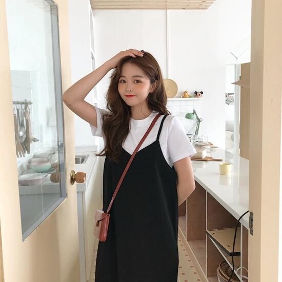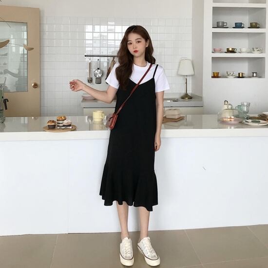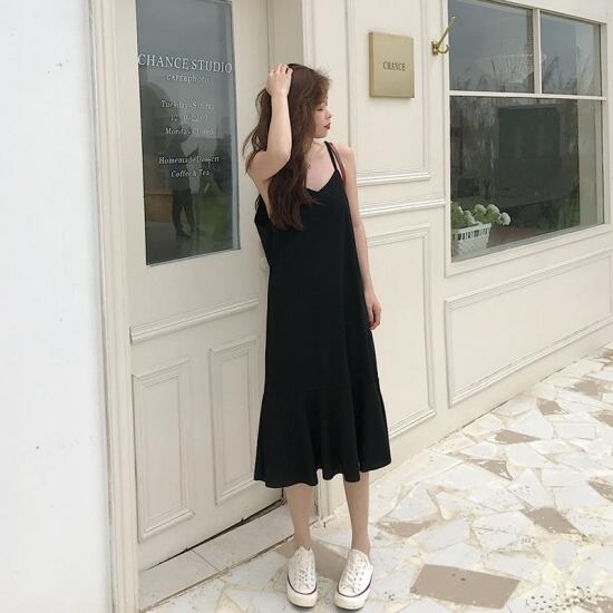 ブラックのミモレ丈ワンピースでほかのアイテムとの相性抜群☆