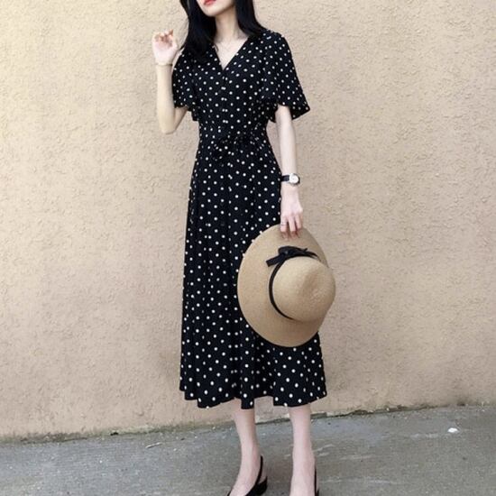 ワンピース レディース ミモレ丈 リゾート 夏 黒 大きいサイズ ドット柄 Aライン ワンピース レディース ミモレ丈 リゾート 夏 黒 大きいサイズ ドット柄 Aライン くびれ ふんわりVネック