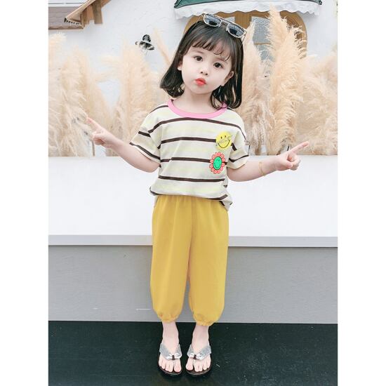 子供服女の子 セットアップ パンツ Tシャツ 半袖 ボーダー スマイル 花 春 夏 パンツ 2点セット カジュアル シンプル かわいい おしゃれ ブラック ブルー イエロー 可愛い キッズ