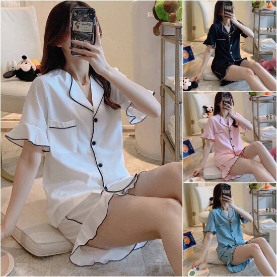 袖と裾にあしらわれたフリルが印象的で可愛らしいセットアップのパジャマです。