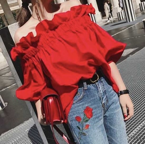 夏に映えるレッドがお洒落なオフショルダートップス。