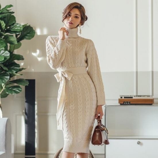 【取寄】ニットワンピース タイト 冬 ケーブルニット 美シルエット ウエストリボン レディース タートルネック ざっくり ひざ丈 ミモレ丈 ミディ丈 秋冬 長袖 ケーブル編み リボン