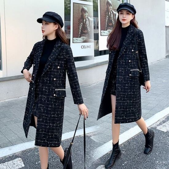 千鳥柄コート+ミニスカートセット、黒コート+ミニスカートセット