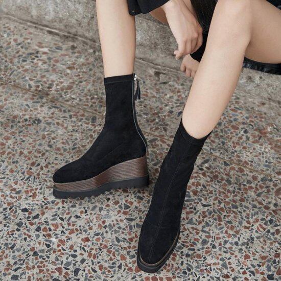 ブーツ レディースブーツ ショートブーツ ハイヒール ウェッジヒール プラットフォーム スクエアトゥ カジュアル スエード調 バックジッパー 冬スペシャルセール 秋冬新作 2色 8cmヒール