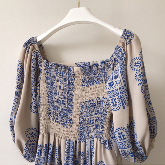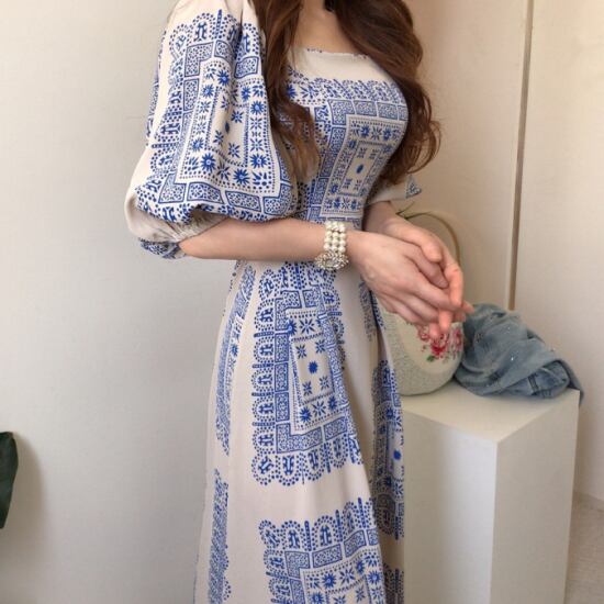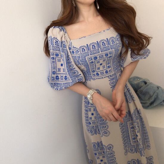 ボリュームたっぷりのパフスリーブが上品なワンピース。