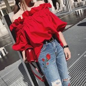 大胆なフリル使いのオフショルとボリュームスリーブがかわいい1枚。