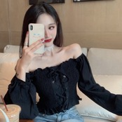 ミニ丈の長袖オフショルダートップス。