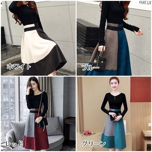 レディース ミモレ丈 膝下 秋冬新作 長袖 バイカラー 切り替え 韓国 ファッション 秋 冬 レディース ミモレ丈 膝下 秋冬新作 長袖