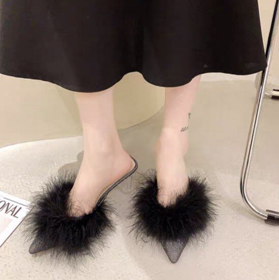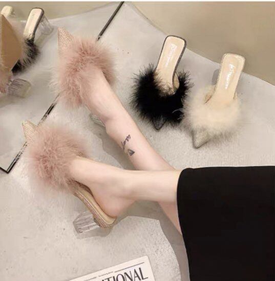 【取寄】ミュール ヒール ミュールサンダル 大きいサイズ ポインテッドトゥ 冬 ファー 太めヒールサンダル サポミュール 透明ハイヒール 美脚 ハイヒール 歩きやすい 履きやすい 秋冬 新作 サンダル 可愛い