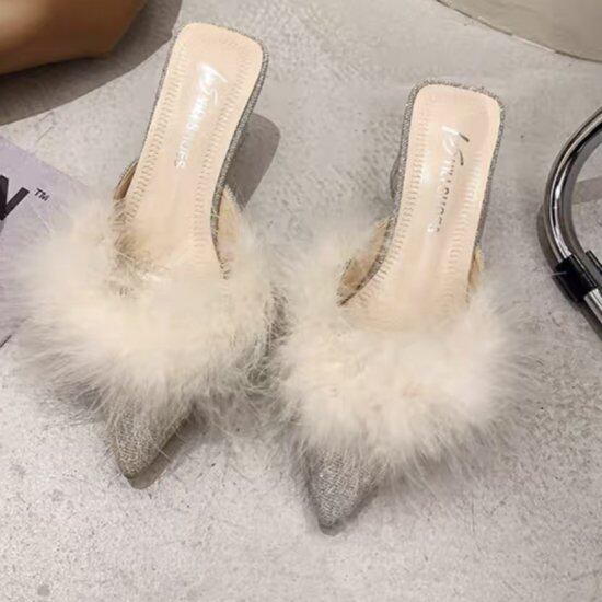 ミュール ヒール ミュールサンダル 大きいサイズ ポインテッドトゥ 冬 ファー 太めヒールサンダル サポミュール 透明ハイヒール 美脚 ハイヒール 歩きやすい 履きやすい 秋冬 新作 サンダル 可愛い