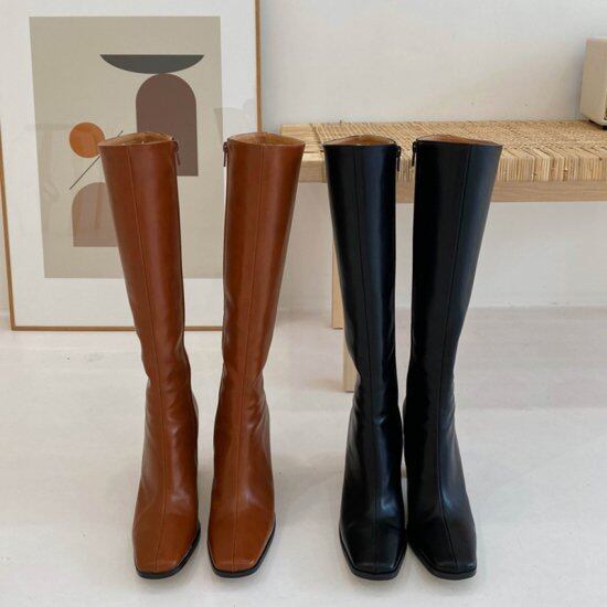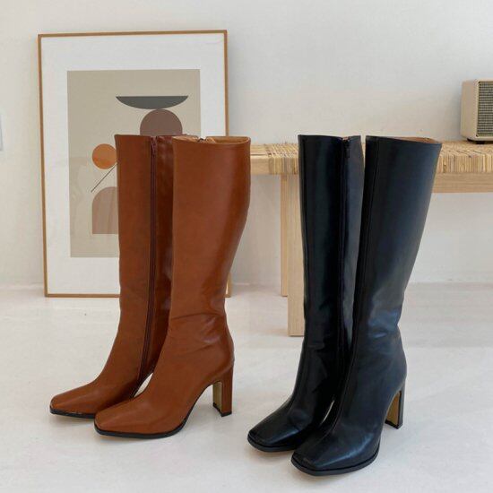 シューズ ブーツ レディース ロングブーツ ハイヒール サイドジッパー おしゃれ ブラック ブラウン PU ロング丈 膝上 スクエアトゥ 9cmヒール 無地 ブーツ 大きいサイズ 春 秋 かわいい