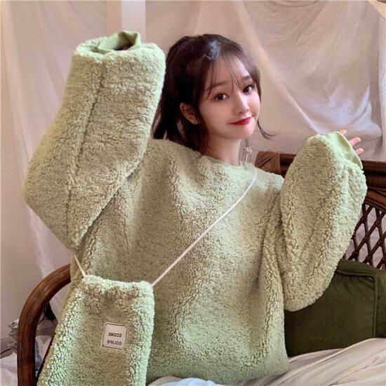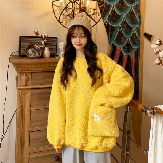 トップス プルオーバー スウェット レディース カラバリ3色 イエロー グリーン アプリコット ポーチ付き シンプル 無地 カジュアルスタイル デイリー 秋冬 新作 サイズ3展開 M L XL