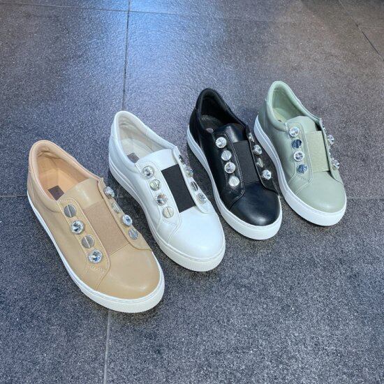 スリッポン レディース カラバリ4色 ブラック グリーン ベージュ ホワイト スニーカー シューズ フラットシューズ ラウンドトゥ カジュアルスタイル フェイクレザー サイズ6展開22.5-25cm