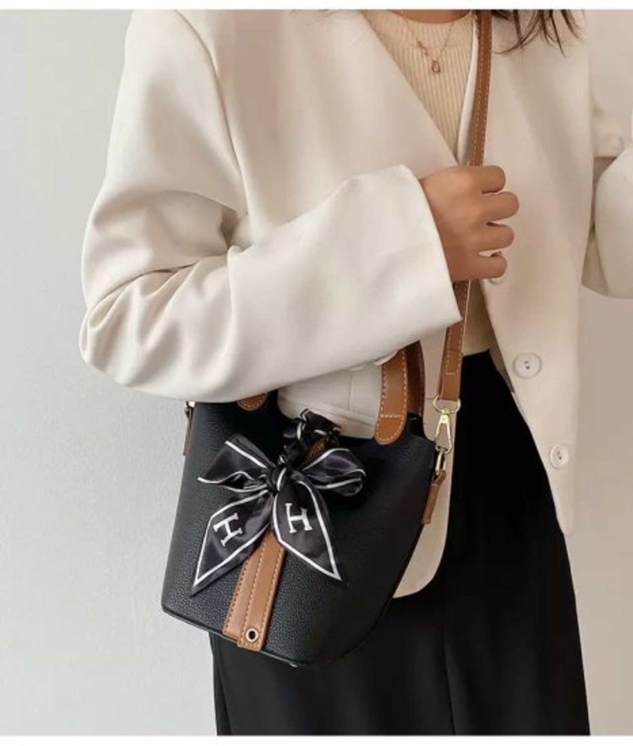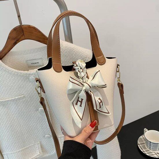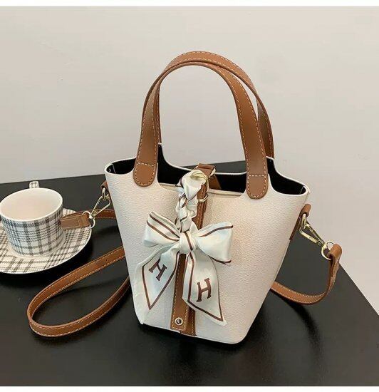 【取寄】ハンドバッグ レディース ショルダーバッグ 肩掛けバッグ 斜め掛け 白 黒 リボン 高級感 大人 きれいめ バケツ型 人気 トレンド コンパクトサイズ 高見え 軽量 プチプラ 韓国風