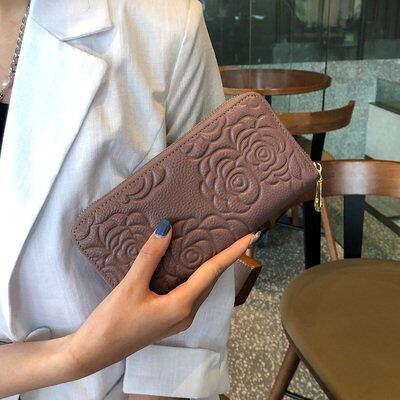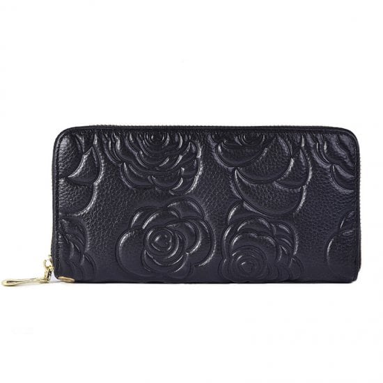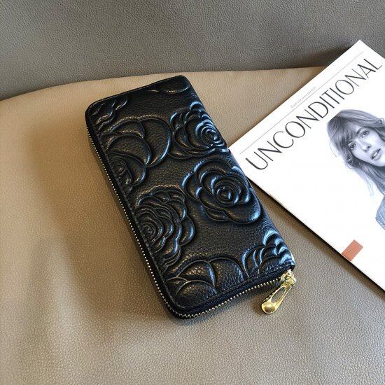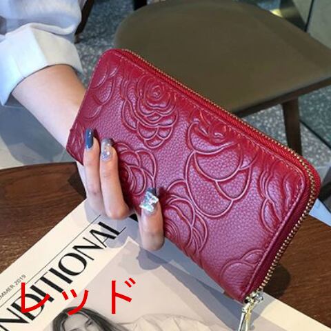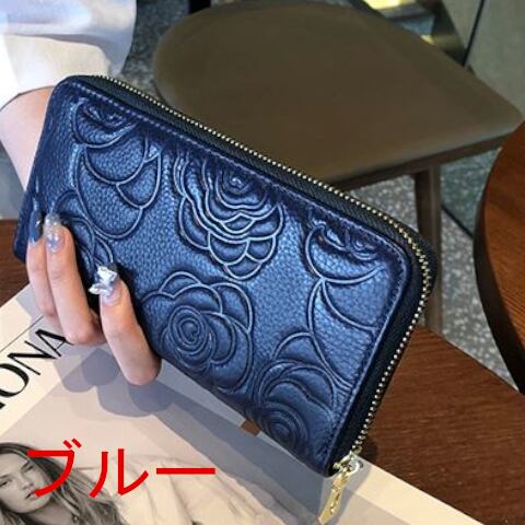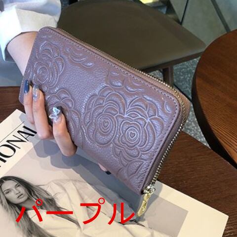 財布 レディース 長財布 レザー 牛革 花柄 エンボス 札入れ カード入れ 小銭入れ ジッパー 大容量 パープル ブラック ブルー レッド 大人可愛い 社会人 学生 通勤 通学 上品 シック デート
