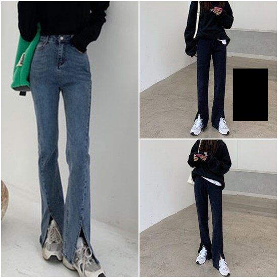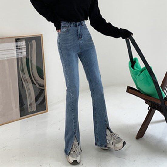 韓国デザインのスリット入りフレアデニムパンツ。