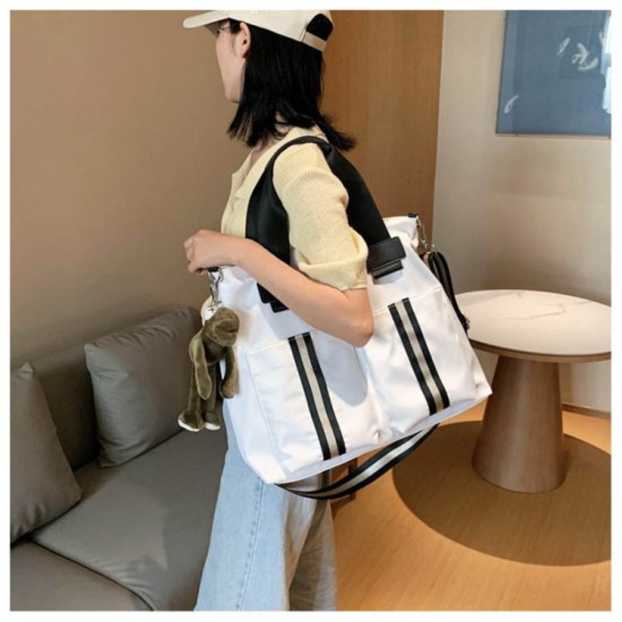 ハンドバッグ レディース カラバリ2色 ブラック ホワイト ロゴ デザイン 大容量 ナイロンバッグ ショルダーバッグ 2way 軽量 ナイロン バイカラー 配色 ジッパー トート 肩掛け カジュアル