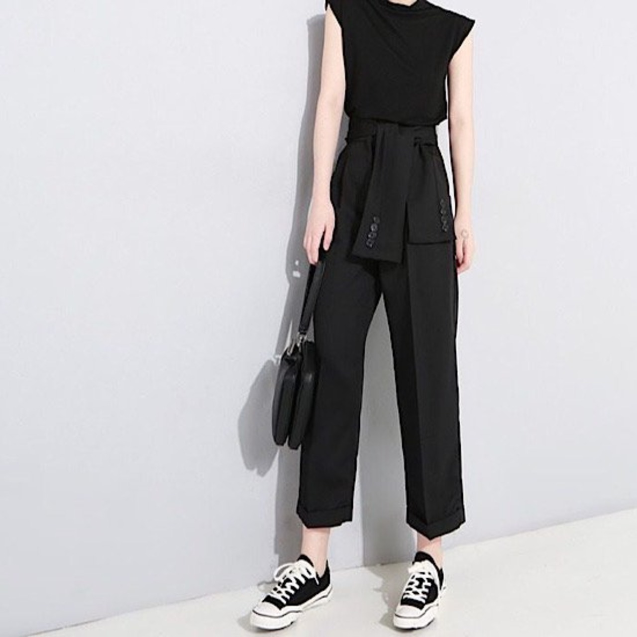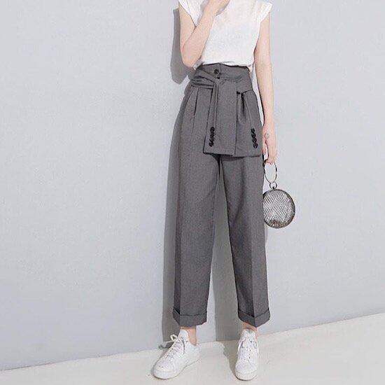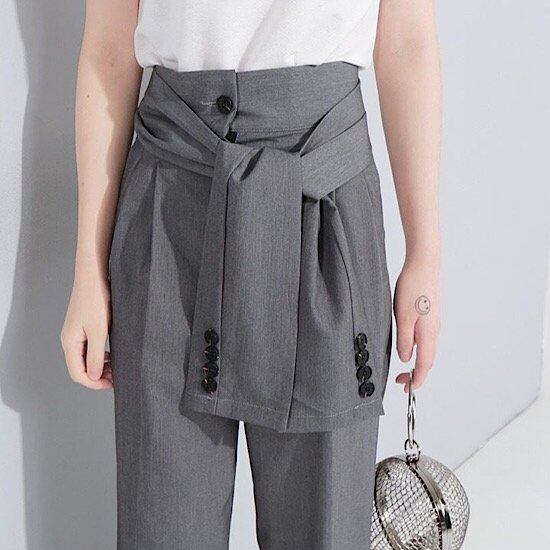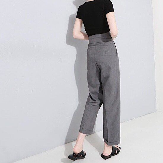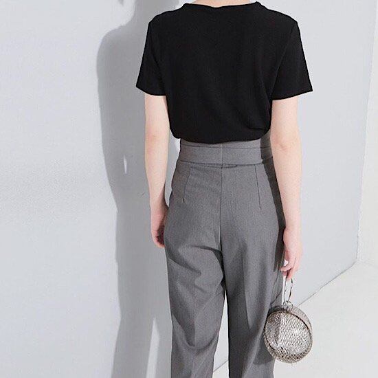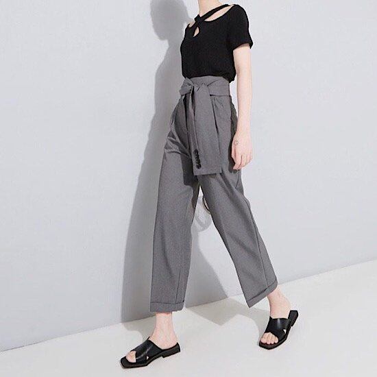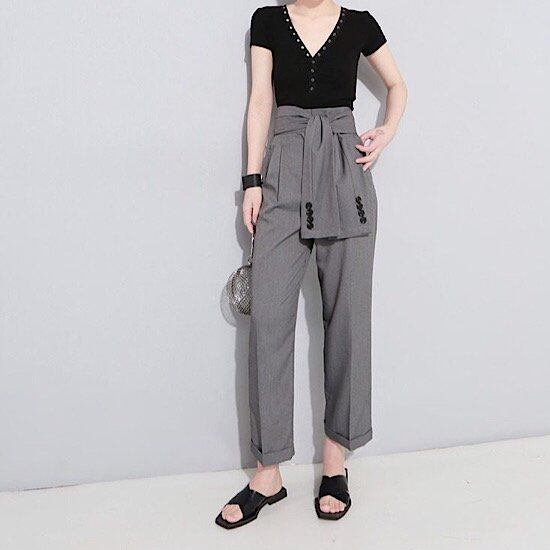 パンツ ハイウエスト レディース テーパード ウエストリボン 春秋 新作 スラックス フェイク ストラップ ハイウエスト リバース フット ワイドレッグ パンツ 無地 ビジネス クール 体型カバー