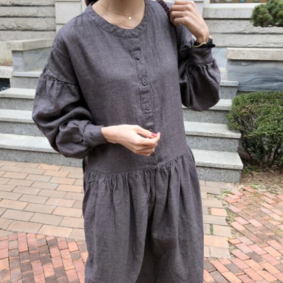 ワンピース レディース 大きいサイズ 春 夏 無地 リネン ラウンドネック 丸首 ロング丈 ロングワンピース グレー ルーズウエスト 10代 20代 30代 大人可愛い 休日 お出かけ リラックス