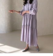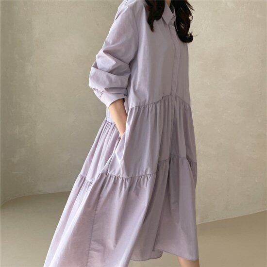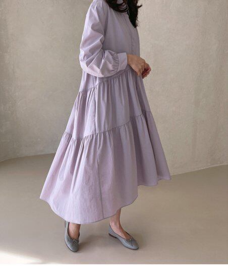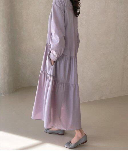 ワンピース ティアードワンピース レディース 大きいサイズ コットン ミモレ丈 ミモレワンピース 無地 上品 大人 かわいい シャツ ひざ下 ラベンダーカラー カジュアル 長袖 Aライン