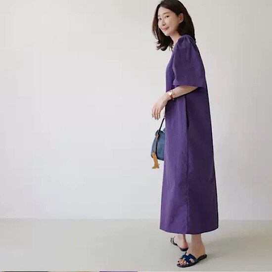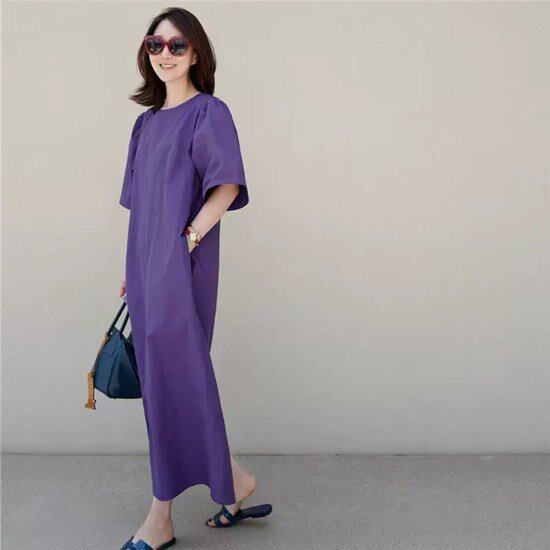 ワンピース ラウンドネック 五分袖 トランペットスリーブ ロング丈 レディース 無地 体型カバー 夏 大きいサイズ ゆったり 春 清楚 カジュアル 大人スタイル スプリングウェア プルオーバー
