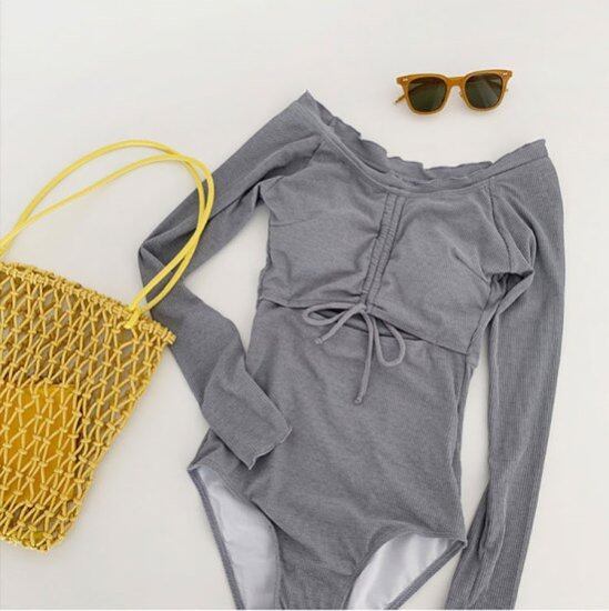 水着 ワンピースビキニ 長袖 レディース Vネック カットアウト フリル フロントリボン 大人 上品 おしゃれ かわいい 海ビーチ プール 長袖水着 スイムウエア ワンピースビキニ 長袖 レディース