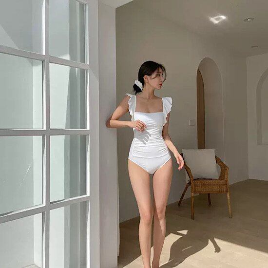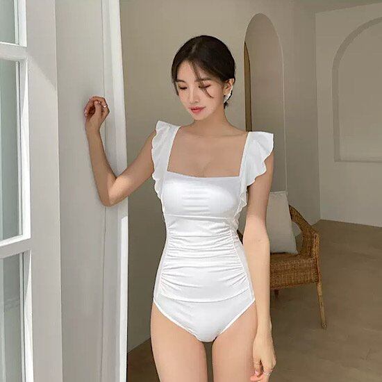 水着 レディース ワンピース水着 スクエアネック ショルダー フリル 体型カバー 水泳 海水浴 プール ビーチ 夏 デザイン スイム マリン ウェア トレンド リゾート 夏 セクシーオープンバック