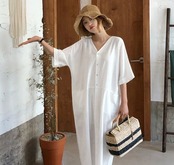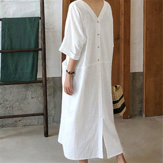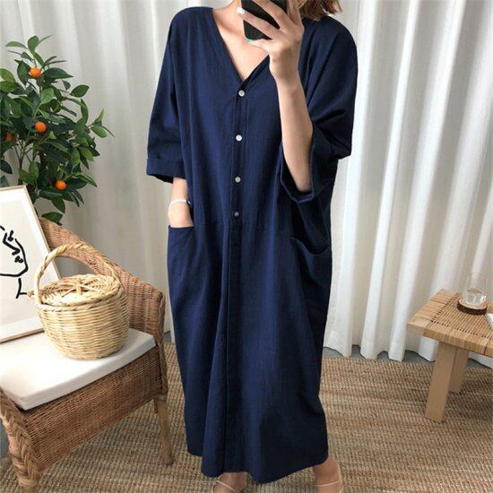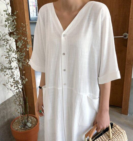 シャツワンピース レディース 大きいサイズ ロングワンピース 春 夏 綿 麻 コットン リネンワンピース Vネック ボタン シンプル 無地 大人 カジュアル ポケット付き ゆったり 5分袖 ロング丈