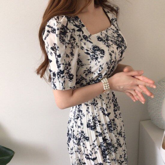 花柄ワンピース レディース ロング丈 ワンピース きれいめ ロングワンピース 半袖 スクエアネック 韓国 レトロ 小花柄 春 夏 プリーツ 大人上品 タイトワンピース セクシー 大人かわいい