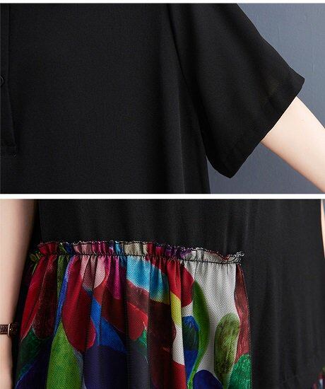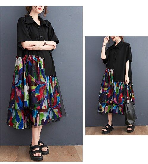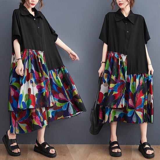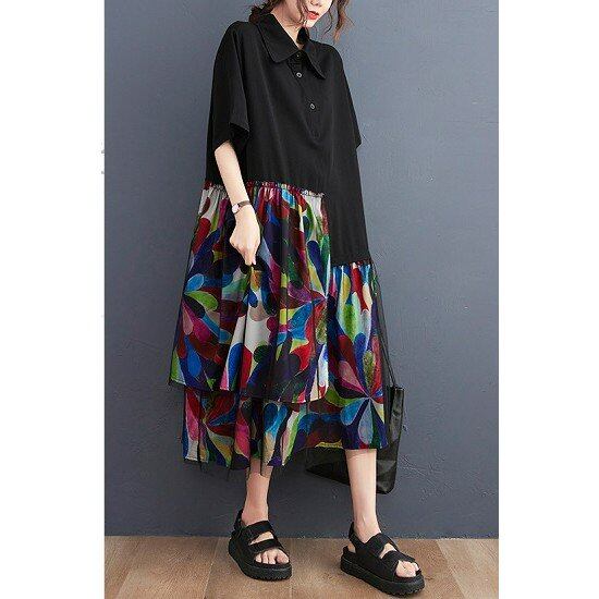 ティアードワンピース ロング 五分袖 レディース 大きいサイズ アシンメトリー ワイドカラー ボタニカル 半袖ワンピース ゆったり 体型カバー 花柄 夏 切り替えワンピ 個性的 大人 カジュアル