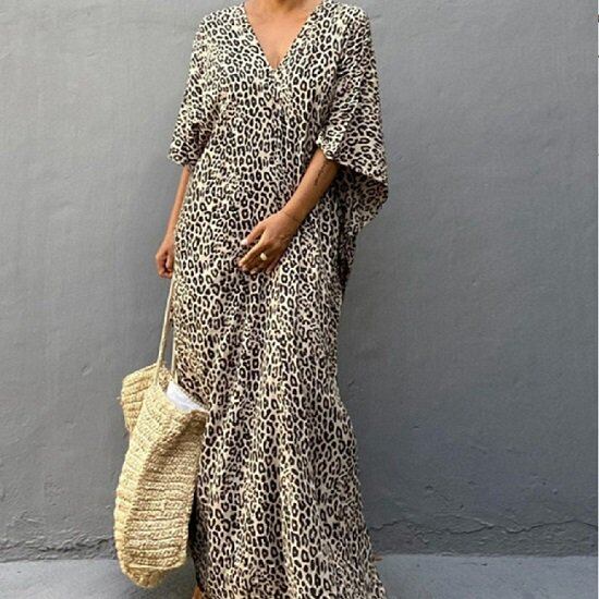 Vネックワンピース ロング レディース レオパード リゾート リラックス ゆったり 大きいサイズ ヒョウ ボヘミアン 夏 バックスタイル ビーチワンピース カジュアル アニマル柄 ハワイ