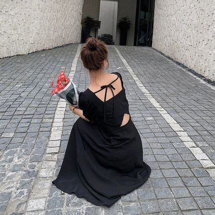 シックなブラックドレスです!デコルテがきれいに見えるラウンドネックで華奢見え